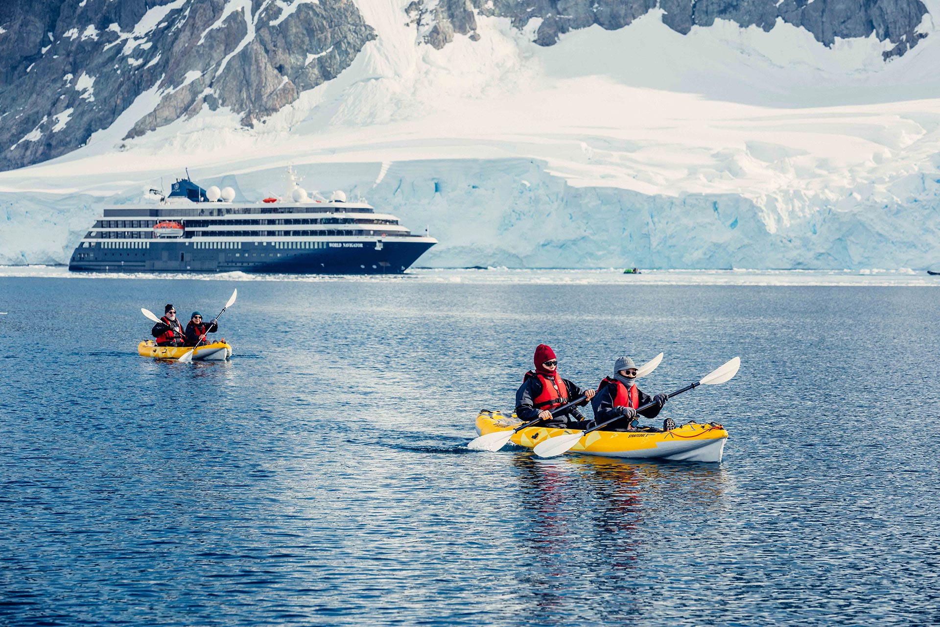 On an optional kayaking excursion in Antarctica, the scale of the polar seascape seems even grander as you paddle past electric blue icebergs and soaring glacial cliffs while seabirds dive for food and marine mammals surface for air.