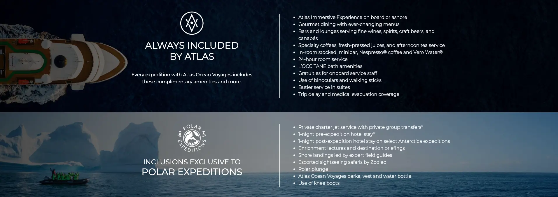 Pricing is based on double occupancy and is subject to change at any time without notice A limited number of triple occupancy rooms are available on each expedition. Space is limited on each expedition. Contact Justin @ 800-390-9211 or fill out a booking request for your reservation. Deposit is $1000 per guest for staterooms and 25% of cruise fare for Journey Suite, Discovery Suite, or Navigator Suite. Final payment is due 130 days prior to travel date. Traveling with Atlas Ocean Voyages is subject to their cruise ticket contract and Avoya Travel’s standard terms and conditions.